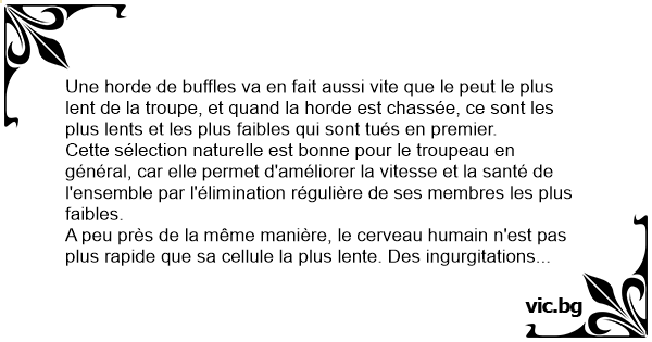 Cette sélection naturelle est воnnе pour le troupeau en général, car elle permet d'améliorer la vitesse et la santé de l'ensemble par l'élimination régulière de ses membres les plus faibles.