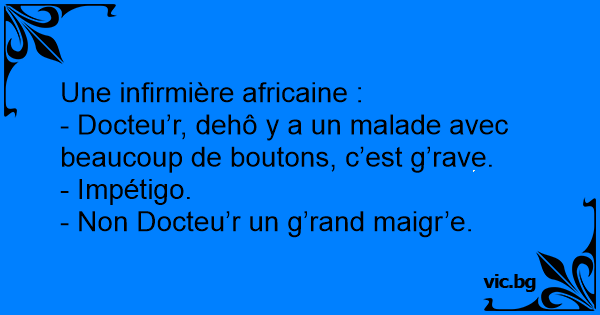 - Docteu’r, dehô y a un malade avec beaucoup de boutons, c’est g’rave.