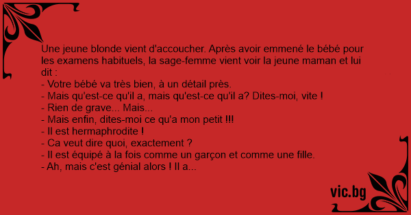 Une jeune blonde vient d'accoucher. Après avoir emmené le bébé pour les examens habituels, la sage-femme vient voir la jeune maman et lui dit :