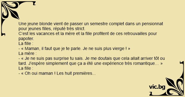 - « Oh oui maman ! Les huit premières fois, c’était formidable. Il n’y a qu’à partir de la neuvième que ça a commencé à faire un peu mal »