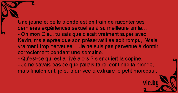 - Oh mon Dieu, tu sais que c’était vraiment super avec Kevin, mais après que son préservatif se soit rompu, j’étais vraiment trop nerveuse… Je ne suis pas parvenue à dormir correctement pendant une semaine.