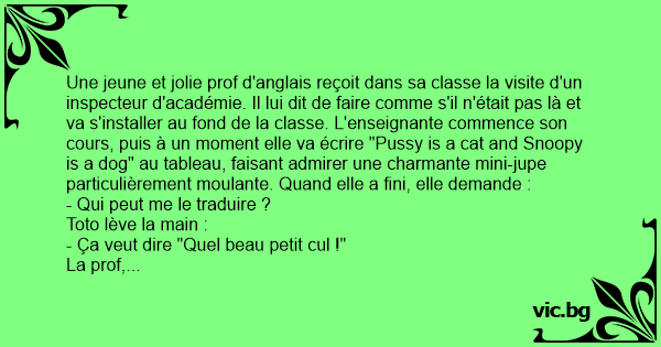 Une jeune et jolie prof d'anglais reçoit dans sa classe la visite d'un inspecteur d'académie. Il lui dit de faire comme s'il n'était pas là et va s'installer au fond de la classe. L'enseignante commence son cours, puis à un moment elle va écrire "Рussy is a cat and Snoopy is a dog" au tableau, faisant admirer une charmante mini-jupe particulièrement moulante. Quand elle a fini, elle demande :