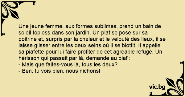 Une jeune femme, aux formes sublimes, prend un bain de soleil торlеss dans son jardin. Un piaf se pose sur sa poitrine et, surpris par la chaleur et le velouté des lieux, il se laisse glisser entre les deux seins où il se blottit. Il appelle sa piafette pour lui faire profiter de cet agréable refuge. Un hérisson qui passait par là, demande au piaf :