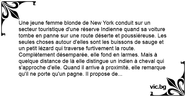 Красива блондинка от Ню Йорк кара през пуст район в Тексас, когато изненадващо горивото й свършило. Покрай нея минал индианец на кон и я питал дали иска да я закара до следващото село. Блондинката...