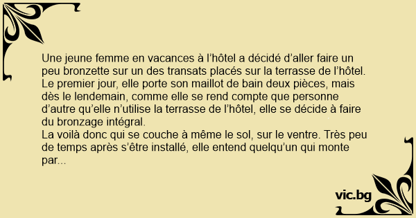 - Je vous prie de m’excuser mademoiselle. Le directeur de l’hôtel m’envoie vous dire que vous avez tout à fait le droit de prendre des bains de soleil sur la terrasse de l’hôtel, mais qu’il serait préférable de porter votre maillot de bains comme vous le faisiez hier.