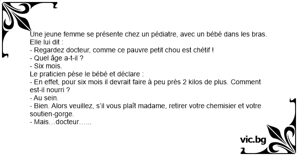 La mujer con el bebé desnutrido пришла женщина с 3-х месячным ребенком к врачу на очередную... Блондинка отива на лекар, за да претеглят бебето, което тя носи на ръце. Жена води бебе на лекар. Жена носи бебе на доктор. Докторот ја прашува: A woman and a baby were in the doctor's examining room, waiting for the Doctor to come in for the baby's first exam. A woman and baby are in the doctors surgery, the doc is concerned about the baby's weight, "Is he bottle fed or breast fed? Una mujer visita al médico con un niño en brazos. -Doctor, estoy desesperada. El nene llora día y noche. El médico examina a la criatura y no encuentra nada anormal. Luego, ordena a la mujer que... Egy asszony egy kisbabával elmegy az orvoshoz. Az orvos megvizsgálja a babát, megméri a súlyát, és megállapítja, hogy egy kicsit soványka. Megkérdezi a nőtől: - Anyatejet vagy tápszert eszik a... Çekici bir genç kadın,çok zayıf bir bebegi doktara kontrole götürür. bebege bakan doktor BU ÇOCUK İYİ GIDA ALMIYOR der ve kadına dönerek lütfen soyununuz diye rica ederek. soyunarak... Çekici bir bayan çok zayıf bir bebeyi kontrole götürür bebeğe bakan doktor bu iyi gıda almıyor der ve kadına dönerek üzeriniz deki herşeyi çıkarın der kadın ne alaka ki der doktor lütfen bunu yapın... Kadın yanında bir bebekle çocuk doktorına gider. Doktor bebeği muayene eder . ‘hanfendi bu çoçuk gıdasız kalmış der. ve kadına soyunmasını söyler . Kadın soyunur. Kadının göğüslerini inceler. ‘evet...