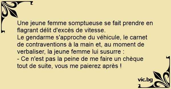 Le gendarme s'approche du véhicule, le carnet de contraventions à la main et, au moment de verbaliser, la jeune femme lui susurre :