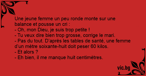 - Pas du tout. D’après les tables de santé, une femme d’un mètre soixante-huit doit peser 60 kilos.