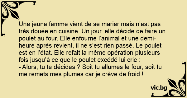 Une jeune femme vient de se marier mais n’est pas très douée en cuisine. Un jour, elle décide de faire un poulet au four. Elle enfourne l’animal et une demi-heure après revient, il ne s’est rien passé. Le poulet est en l’état. Elle refait la même opération plusieurs fois jusqu’à ce que le poulet excédé lui crie :