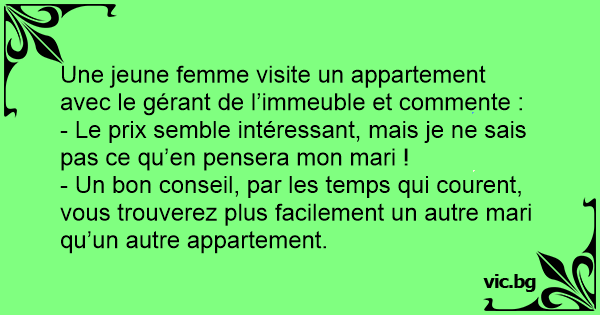 - Un bon conseil, par les temps qui courent, vous trouverez plus facilement un autre mari qu’un autre appartement.