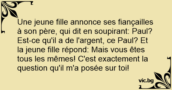 Une jeune fille annonce ses fiançailles à son père, qui dit en soupirant: Paul? Est-ce qu'il a de l'argent, ce Paul? Et la jeune fille répond: Mais vous êtes tous les mêmes! C'est exactement la question qu'il m'a posée sur toi!