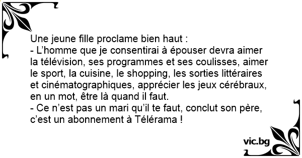 - Ce n’est pas un mari qu’il te faut, conclut son père, c’est un abonnement à Télérama !