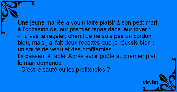 Une jeune mariée a voulu faire plaisir à son petit mari à l’occasion de leur premier repas dans leur foyer :