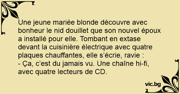 Une jeune mariée blonde découvre avec bonheur le nid douillet que son nouvel époux a installé pour elle. Tombant en extase devant la cuisinière électrique avec quatre plaques chauffantes, elle s’écrie, ravie :