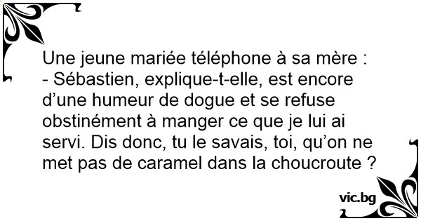- Sébastien, explique-t-elle, est encore d’une humeur de dogue et se refuse obstinément à manger ce que je lui ai servi. Dis donc, tu le savais, toi, qu’on ne met pas de caramel dans la choucroute ?
