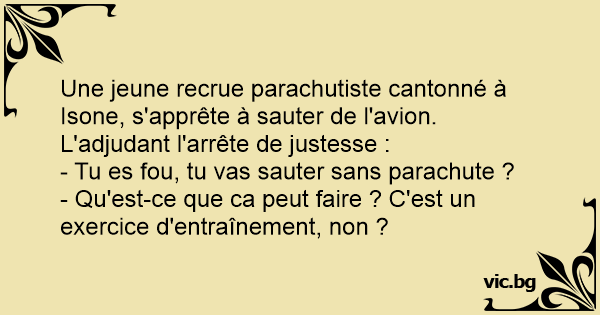 Une jeune recrue parachutiste cantonné à Isone, s'apprête à sauter de l'avion. L'adjudant l'arrête de justesse :