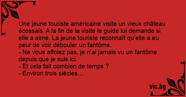 Un touriste visite un château en Écosse. Il s'adresse au châtelain : - On m'a dit que votre château était hanté ! - Hanté mon château ? Y'a jamais eu aucun fantôme ici ! Et pourtant ça fait 300 ans...
