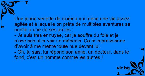 - Je suis très ennuyée, car je souffre du foie et je n’ose pas aller voir un médecin. Ça m’impressionne d’avoir à me mettre toute nue devant lui.
