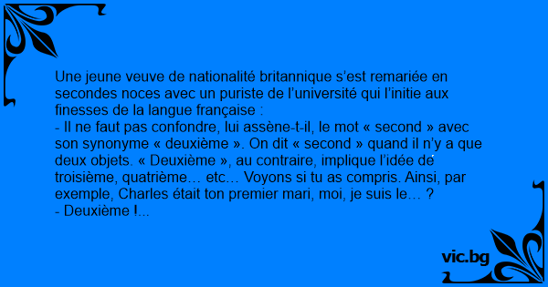 - Il ne faut pas confondre, lui assène-t-il, le mot « second » avec son synonyme « deuxième ». On dit « second » quand il n’y a que deux objets. « Deuxième », au contraire, implique l’idée de troisième, quatrième… etc… Voyons si tu as compris. Ainsi, par exemple, Charles était ton premier mari, moi, je suis le… ?