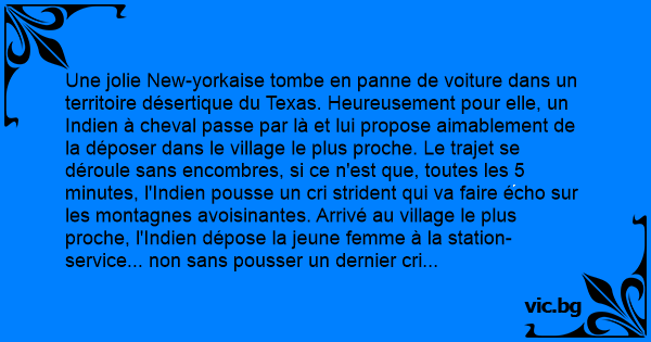 Красива блондинка от Ню Йорк кара през пуст район в Тексас, когато изненадващо горивото й свършило. Покрай нея минал индианец на кон и я питал дали иска да я закара до следващото село. Блондинката...
