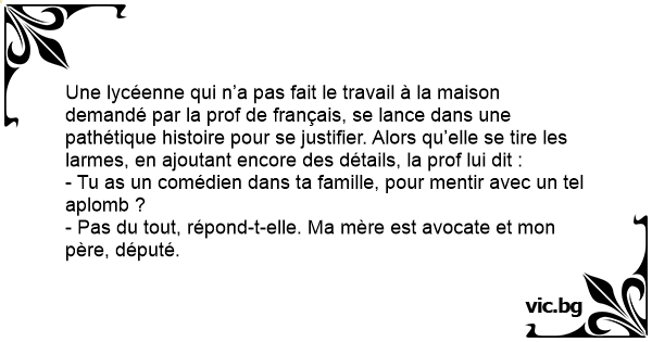 Une lycéenne qui n’a pas fait le travail à la maison demandé par la prof de français, se lance dans une pathétique histoire pour se justifier. Alors qu’elle se tire les larmes, en ajoutant encore des détails, la prof lui dit :