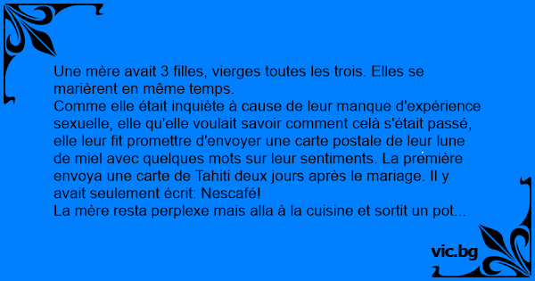 Comme elle était inquiète à cause de leur manque d'expérience sexuelle, elle qu'elle voulait savoir comment celà s'était passé, elle leur fit promettre d'envoyer une carte postale de leur lune de miel avec quelques mots sur leur sentiments. La première envoya une carte de Tahiti deux jours après le mariage. Il y avait seulement écrit: Nescafé!