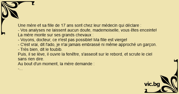 - Voyons, docteur, ce n'est pas possible! Ma fille est vierge!