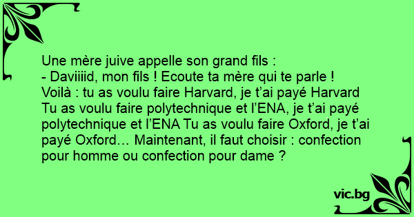 - Daviiiid, mon fils ! Ecoute ta mère qui te parle ! Voilà : tu as voulu faire Harvard, je t’ai payé Harvard Tu as voulu faire polytechnique et l’ENA, je t’ai payé polytechnique et l’ENA Tu as voulu faire Oxford, je t’ai payé Oxford… Maintenant, il faut choisir : confection pour homme ou confection pour dame ?