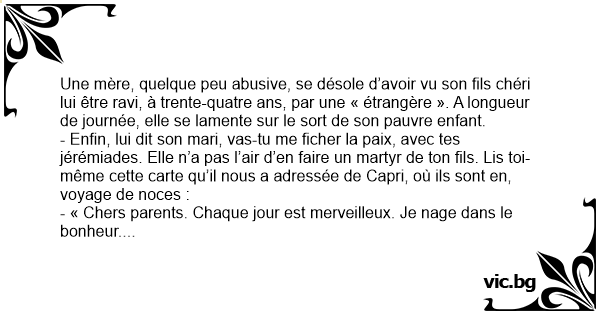 - Enfin, lui dit son mari, vas-tu me ficher la paix, avec tes jérémiades. Elle n’a pas l’air d’en faire un martyr de ton fils. Lis toi-même cette carte qu’il nous a adressée de Capri, où ils sont en, voyage de noces :