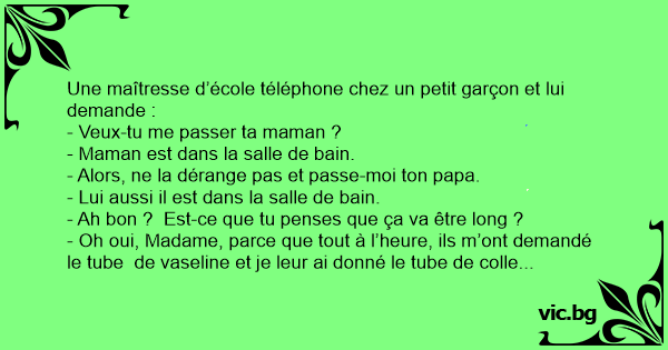 - Oh oui, Madame, parce que tout à l’heure, ils m’ont demandé le tube de vaseline et je leur ai donné le tube de colle...