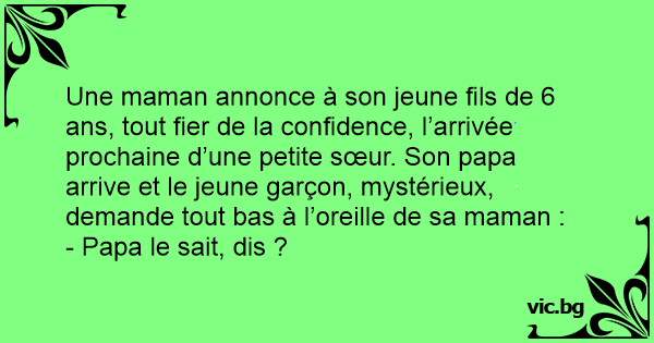 Une maman annonce à son jeune fils de 6 ans, tout fier de la confidence, l’arrivée prochaine d’une petite sœur. Son papa arrive et le jeune garçon, mystérieux, demande tout bas à l’oreille de sa maman :