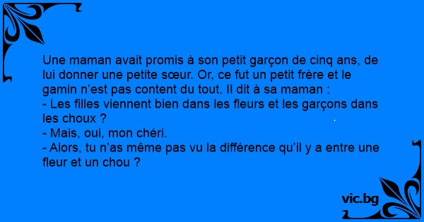 Une maman avait promis à son petit garçon de cinq ans, de lui donner une petite sœur. Or, ce fut un petit frère et le gamin n’est pas content du tout. Il dit à sa maman :