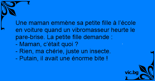 Une maman emmène sa petite fille à l’école en voiture quand un vibromasseur heurte le pare-brise. La petite fille demande :