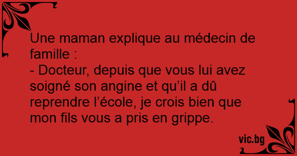 - Docteur, depuis que vous lui avez soigné son angine et qu’il a dû reprendre l’école, je crois bien que mon fils vous a pris en grippe.