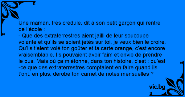 - Que des extraterrestres aient jailli de leur soucoupe volante et qu’ils se soient jetés sur toi, je veux bien le croire. Qu’ils t’aient volé ton goûter et ta carte orange, c’est encore vraisemblable. Ils pouvaient avoir faim et envie de prendre le bus. Mais où ça m’étonne, dans ton histoire, c’est : qu’est-ce que des extraterrestres comptaient en faire quand ils t’ont, en plus, dérobé ton carnet de notes mensuelles ?