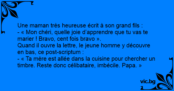 - « Ta mère est allée dans la cuisine pour chercher un timbre. Reste donc célibataire, imbécile. Papa. »
