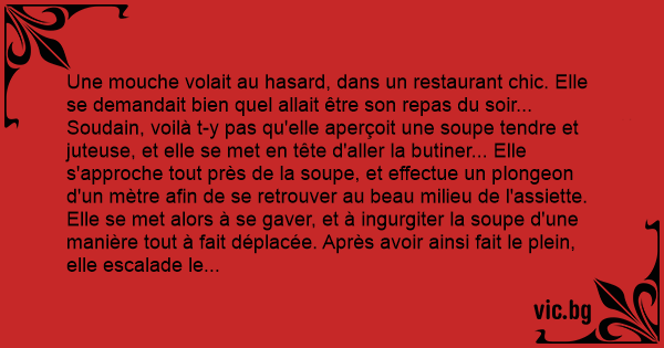 Une mouche volait au hasard, dans un restaurant chic. Elle se demandait bien quel allait être son repas du soir... Soudain, voilà t-y pas qu'elle aperçoit une soupe tendre et juteuse, et elle se met en tête d'aller la butiner... Elle s'approche tout près de la soupe, et effectue un plongeon d'un mètre afin de se retrouver au beau milieu de l'assiette.