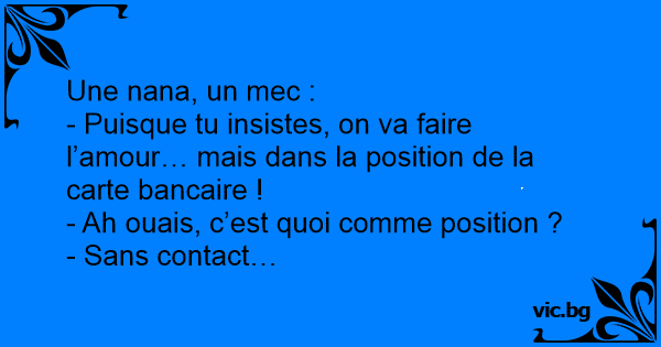 - Puisque tu insistes, on va faire l’amour… mais dans la position de la carte bancaire !