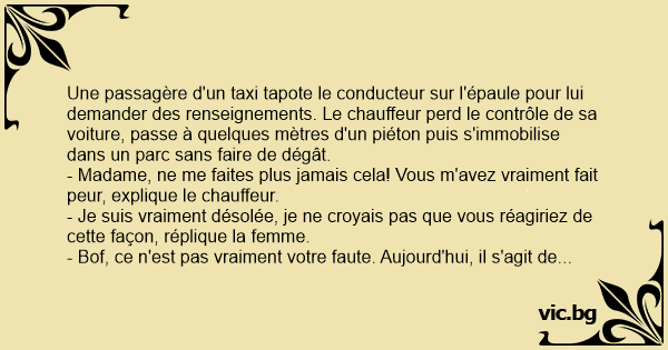 Un homme, dans un taxi, veut parler au chauffeur. Il se penche et, pour attirer son attention, lui tape gentillement sur l’épaule. Le chauffeur jette un cri horrible, s’agrippe au volant et appuie sur l’accélérateur, si bien qu’il sort de la route et va s’écraser sur un platane. Le pauvre client,...