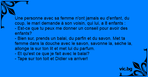 Une personne avec sa femme n'ont jamais eu d'enfant, du coup, le mari demande à son voisin, qui lui, a 8 enfants :