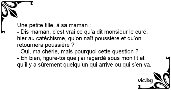 - Dis maman, c’est vrai ce qu’a dit monsieur le curé, hier au catéchisme, qu’on naît poussière et qu’on retournera poussière ?