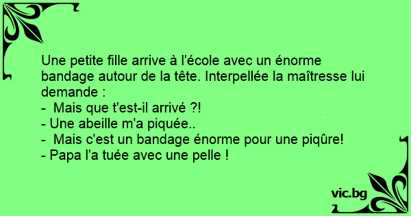 Une petite fille arrive à l'école avec un énorme bandage autour de la tête. Interpellée la maîtresse lui demande :