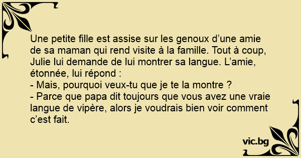 Une petite fille est assise sur les genoux d’une amie de sa maman qui rend visite à la famille. Tout à coup, Julie lui demande de lui montrer sa langue. L’amie, étonnée, lui répond :