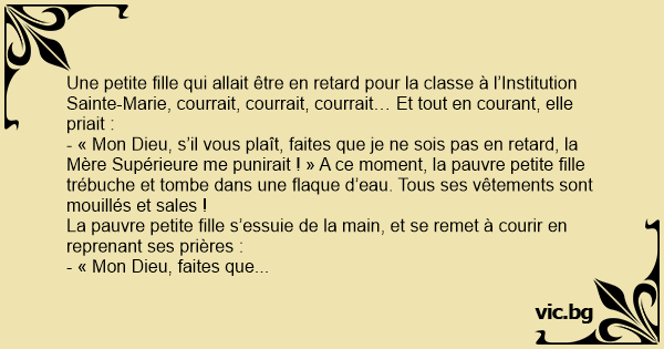 Une petite fille qui allait être en rетаrd pour la classe à l’Institution Sаinте-Marie, courrait, courrait, courrait… Et tout en courant, elle priait :