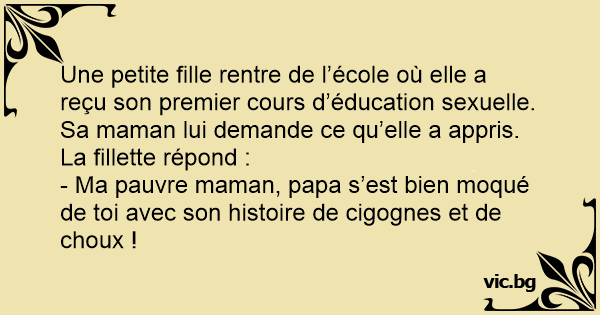 Une petite fille rentre de l’école où elle a reçu son premier cours d’éducation sexuelle. Sa maman lui demande ce qu’elle a appris. La fillette répond :
