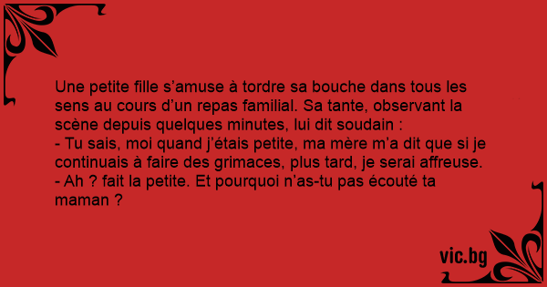 Une petite fille s’amuse à tordre sa bouche dans tous les sens au cours d’un repas familial. Sa tante, observant la scène depuis quelques minutes, lui dit soudain :