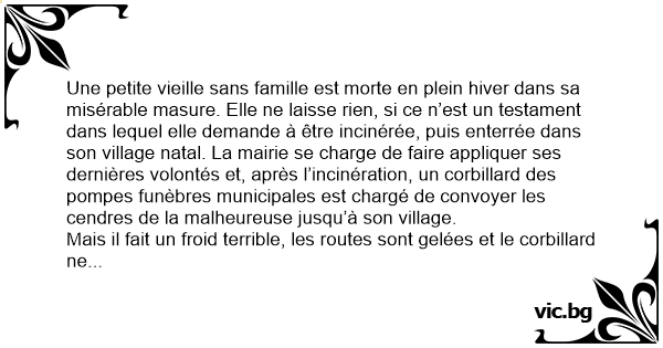 Une petite vieille sans famille est morte en plein hiver dans sa misérable masure. Elle ne laisse rien, si ce n’est un testament dans lequel elle demande à être incinérée, puis enterrée dans son village natal. La mairie se charge de faire appliquer ses dernières volontés et, après l’incinération, un corbillard des pompes funèbres municipales est chargé de convoyer les cendres de la malheureuse jusqu’à son village.