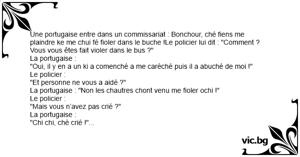 Une portugaise entre dans un commissariat : Bonchour, ché fiens me plaindre ke me chui fé fioler dans le buche !Le policier lui dit : "Comment ? Vous vous êtes fait violer dans le bus ?"