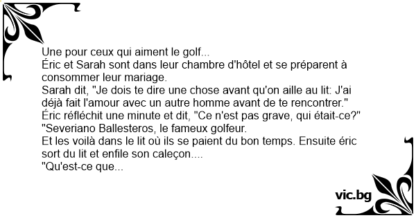 Sarah dit, "Je dois te dire une chose avant qu'on aille au lit: J'ai déjà fait l'amour avec un autre homme avant de te rencontrer."
