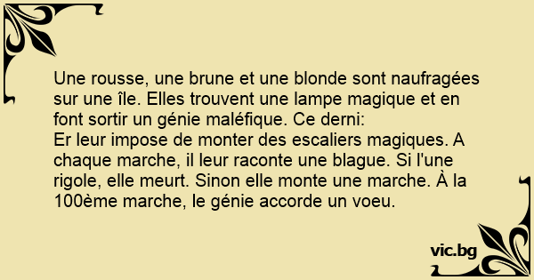Er leur impose de monter des escaliers magiques. A chaque marche, il leur raconte une blague. Si l'une rigole, elle meurt. Sinon elle monte une marche. À la 100ème marche, le génie accorde un voeu.